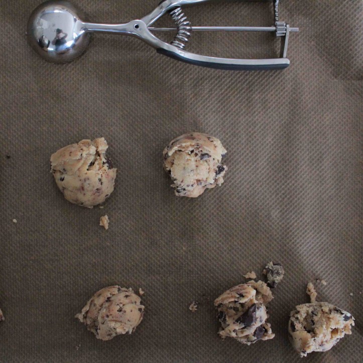 Bætið þurrefnunum út í smjörblönduna og blandið saman með sleif eða sleikju. Bætið súkkulaðibitunum út í. Setjið filmu yfir skálina og kælið deigið í ca. 2 klst. Ef þið kælið það lengur en 4 klst þurfið þið að leyfa því að standa við stofuhita í ca. 30 mínútur.
