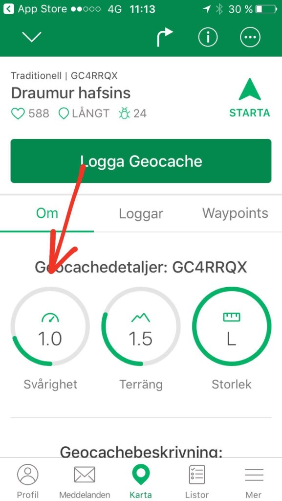 Terrain táknar hversu erfitt svæðið er yfirferðar. 1 er flatlendi, 5 getur verið neðanjarðar í stöðuvatni. Ég leita bara að einhverju sem er ekki meira en 2 – af sömu ástæðu og ofan. Við erum ekki á þeim stað þar sem við viljum vera klifra upp í trjám til að leita að cöchum. Ég myndi sennilega leita að cachi sem er með terrain 1 í fyrsta skipti sem ég leita.