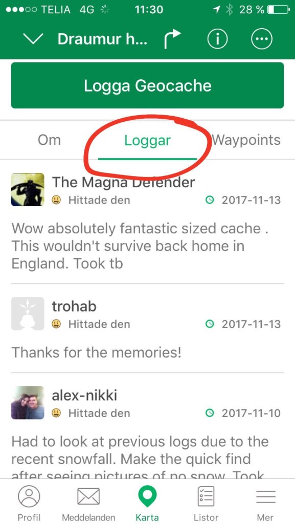 Það getur verið sniðugt að kíkja á hvort fjársjóðurinn hefur verið fundinn nýlega. Það gerist oft að fjársjóðir týnast (eða er stolið) eða skemmast og þá kemur það fram á heimasíðunni/appinu – þar eru svokallaðir loggar sem „finnendur“ skrifa og ef það er orðið mjög langt síðan hann var fundinn síðast þá er það ástæða til að staldra aðeins við. Það er ekki gaman að drífa sig út í geochaching skemmtun bara til að komast að því að fjársjóðurinn er horfinn.