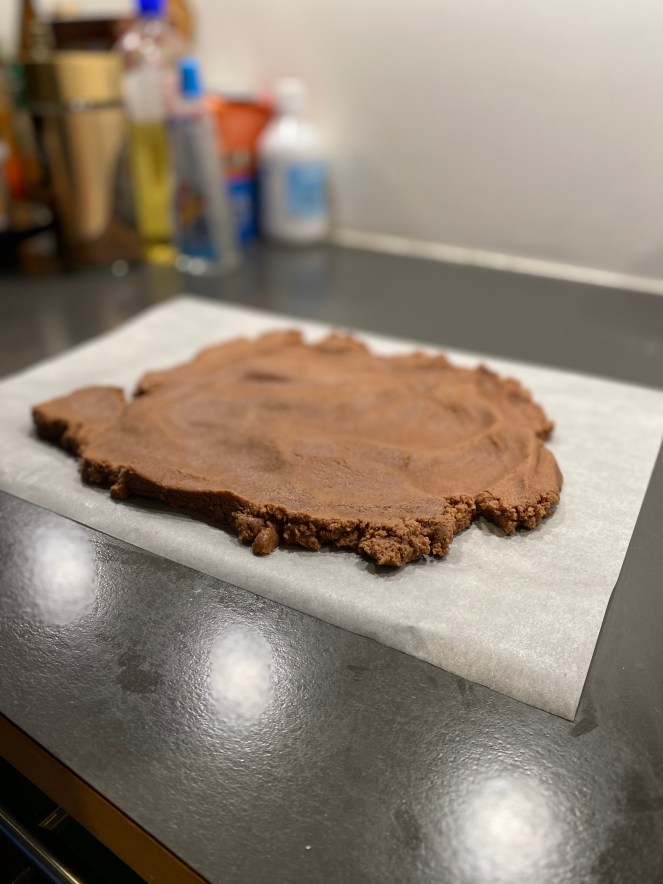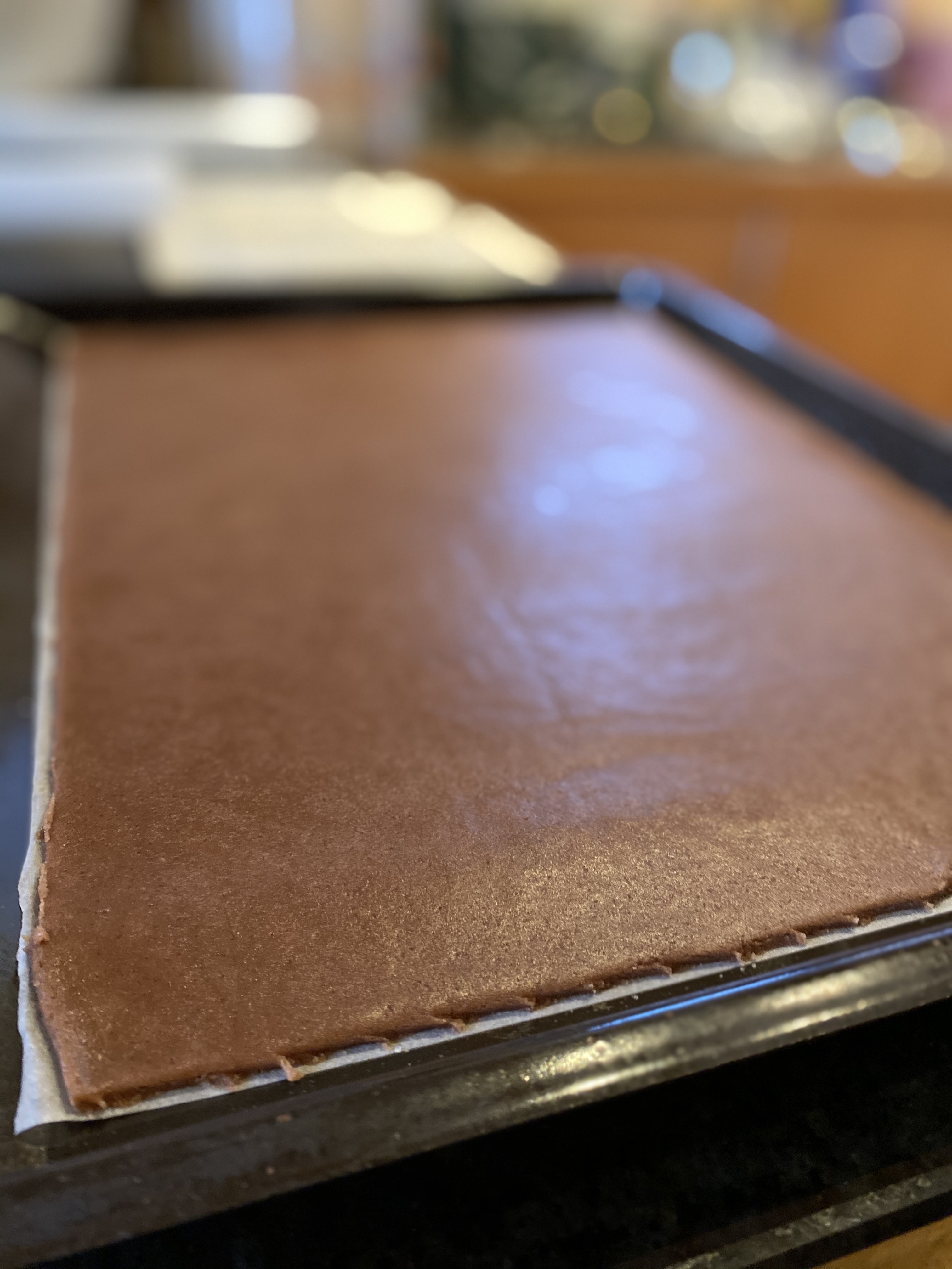 2. Deiginu skipt í 4 jafna hluta og hver hluti flattur út á bökunarpappír (sem er jafnstór og ofnskúffan sem kakan er bökuð í). Sjá mynd að neðan. Best er að setja deigið á bökunarpappír og fletja það út/dreifa vel úr því með höndunum til að byrja með. Svo er annar bökunarpappír settur ofan á og deigið flatt út með kökukefli til að ná því jöfnu og sléttu.