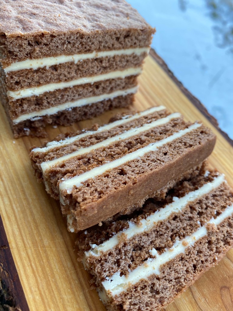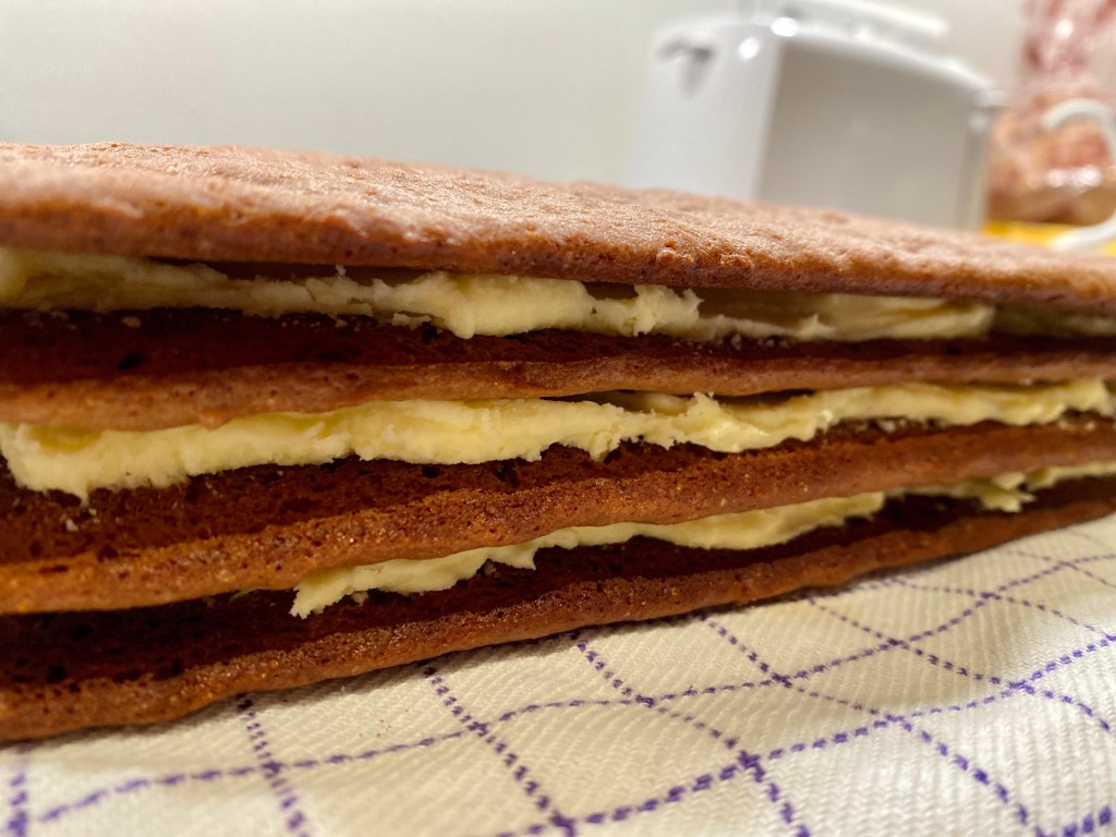 5. Kakan sett saman: Kreminu skipt í þrjá jafna hluta og smurt á kökubotnana, sem er staflað saman – einn á eftir öðrum með kremi á milli. Endið á kökubotni. Kantarnir eru skornir af og kakan er svo skorin ca 8 jafna bita (smekksatriði). Til að mýkja kökuna aðeins upp áður en hún er skorin má setja blautt viskastykki yfir hana í dálitla stund. Kakan geymis aftar vel í frysti 🙂