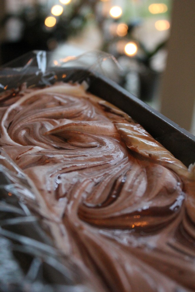 Blandið öllum lögum íssins saman í formi (t.d. aflöngu brauðformi eða springformi), sem búið er að klæða með plastfilmu. Setjið fyrst grunninn í formið og síðan lag 2 og 3. Notið skeið eða hníf til að hræra í ísnum án þess þó að hræra honum alveg 100% saman (maður vill að íslögin sjáist almennilega – sjá mynd).