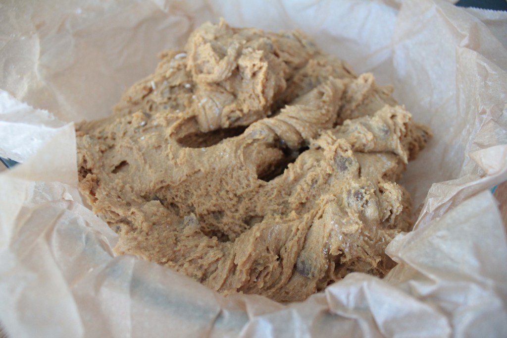 Þeytið smjör og púðursykur vel saman í hrærivél. Bætið eggjunum út í ásamt eggjarauðunni. Bætið vanilludropunum út í. Blandið þurrefnunum út í með sleif. Deigið er þykkt. Blandið súkkulaðibitunum og valhnetunum saman við.