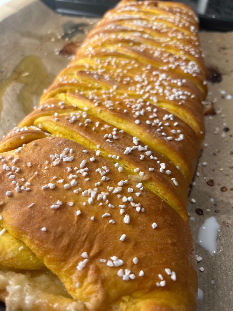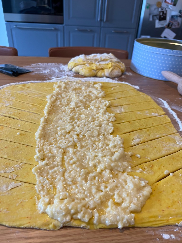 Fletjið helminginn af deiginu út á hveitistráðan bekk, ca. 30×40 cm. Smyrjið fyllingunni í miðjuna á deiginu, sjá mynd. Skerið ræmur í deigið sitthvoru megin við fyllinguna (sjá mynd) og fléttið svo deigið saman. Klípið fyrir endana á deiginu (svo fyllingin leki ekki of mikið út). Penslið deigið með mjólk, og stráið perlusykri yfir.