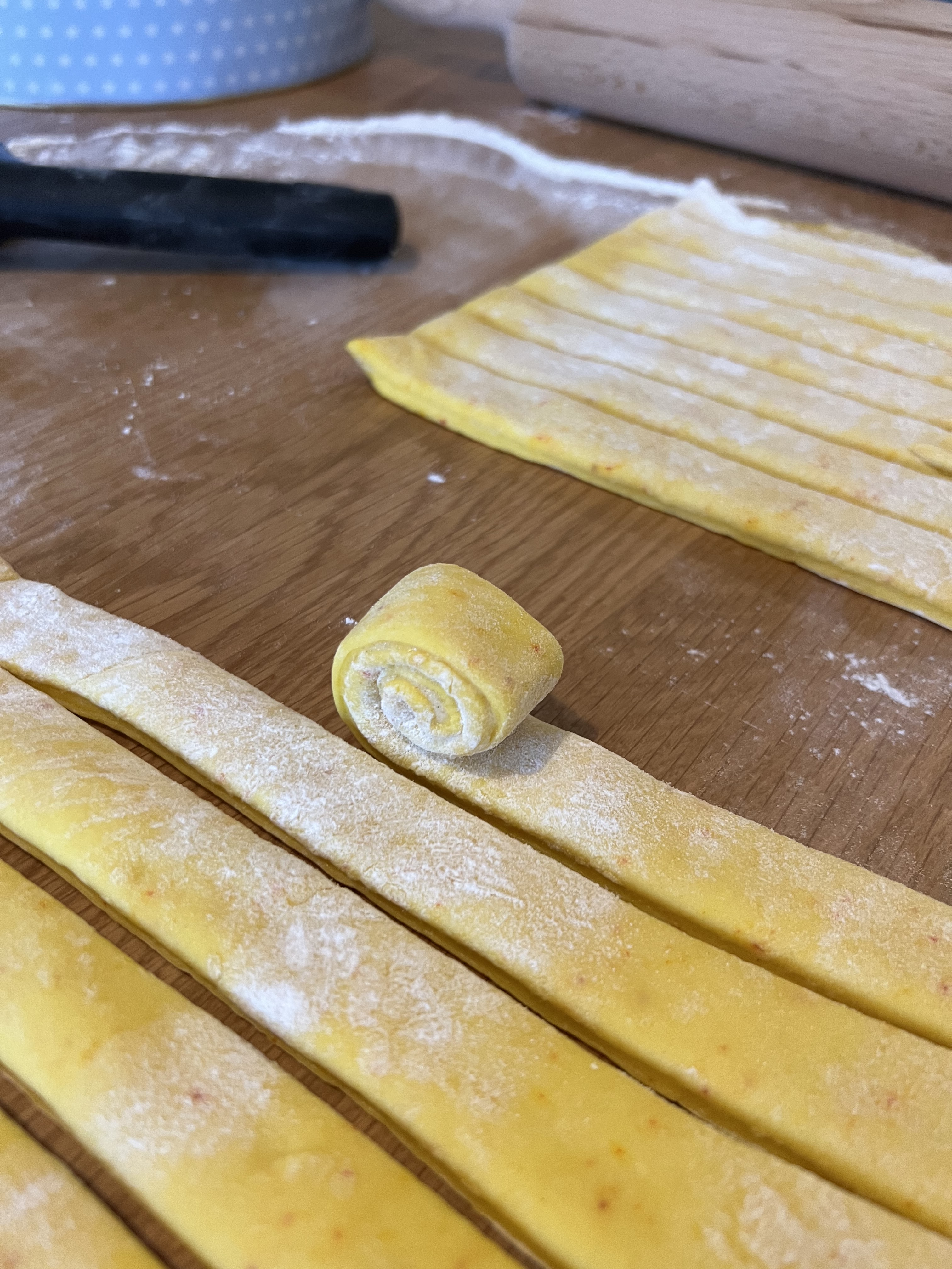 Fletjið helminginn af deiginu út á hveitistráðan bekk. Setjið vanillufyllinguna á helming deigsins (sjá mynd). Brjótið svo deigið saman um það þvert og skerið deigið í ræmur. Hverri ræmu er svo rúllað upp í það form sem óskað er eftir.