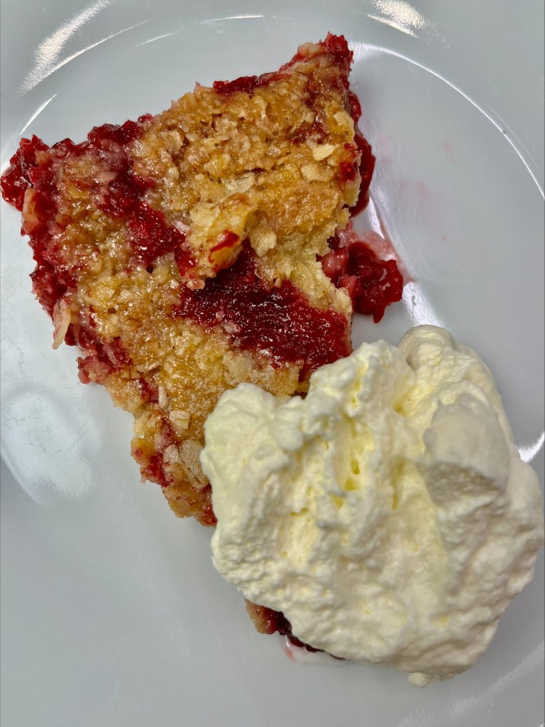 Smjörið brætt, þurrefnum og sírópi bætt út í og blandað vel saman. Deigið er svo sett yfir berjafyllinguna, slétt með hníf eða skeið.